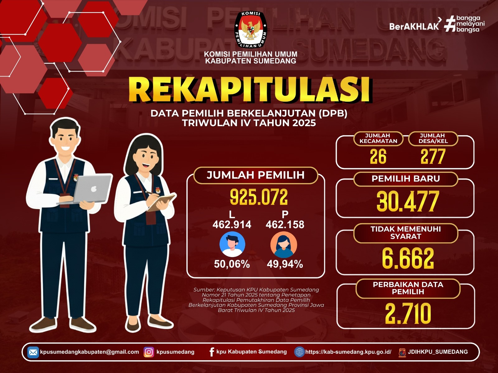 Pada hari ini Senin tanggal Delapan bulan Desember tahun Dua Ribu Dua Puluh Lima bertempat di Kabupaten Sumedang, Komisi Pemilihan Umum Kabupaten Sumedang telah melaksanakan Rapat Pleno Terbuka Rekapitulasi Daftar Pemilih Berkelanjutan Triwulan IV Tahun 2025 tingkat Kabupaten Sumedang.