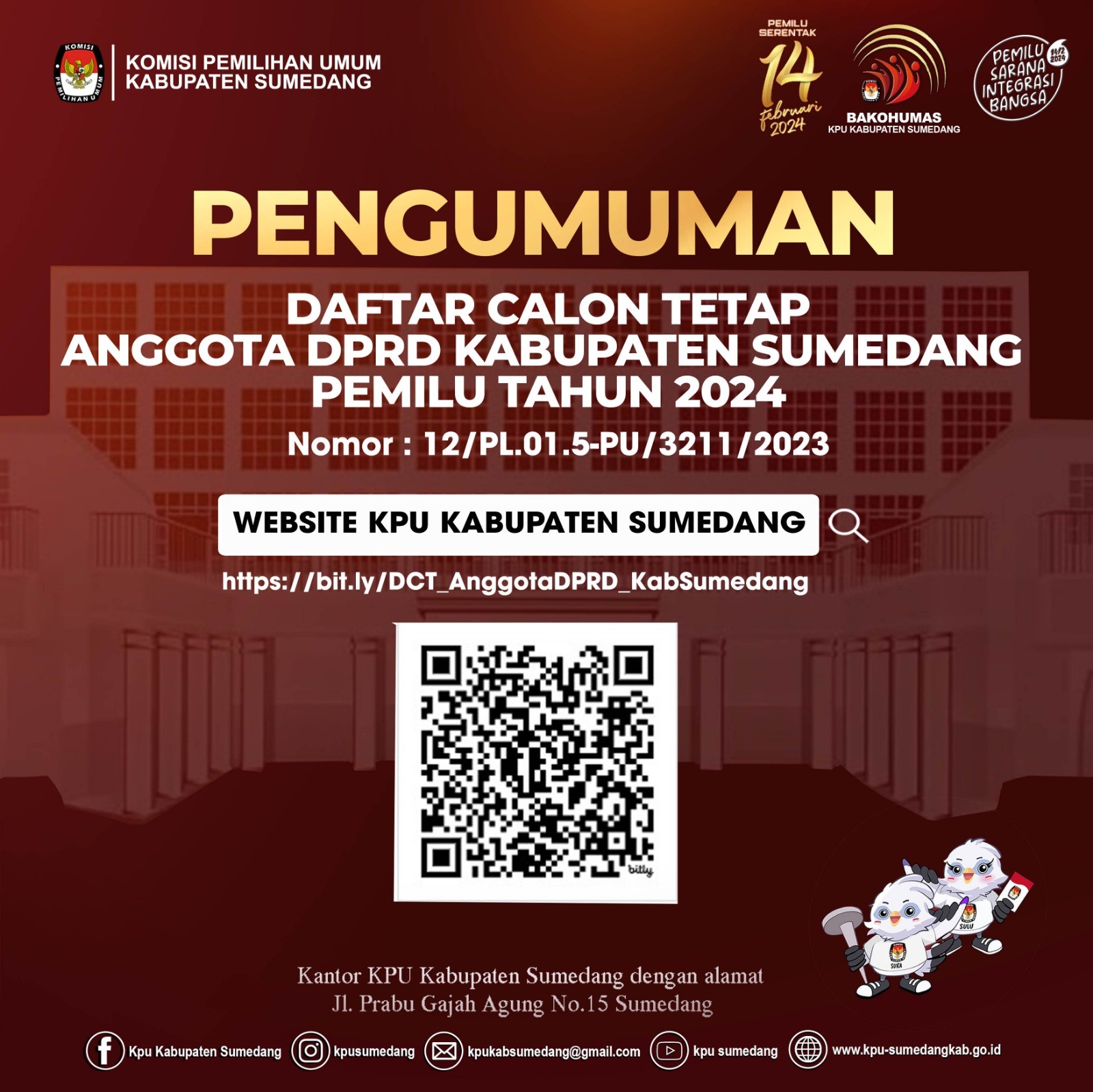 Bahwa untuk melaksanakan ketentuan Pasal 85 ayat (1) Peraturan KPU Nomor 10 Tahun 2023 tentang Pencalonan Anggota Dewan Perwakilan Rakyat, Dewan Perwakilan Rakyat Daerah Provinsi, dan Dewan Perwakilan Rakyat Daerah Kabupaten/Kota dan berdasarkan Keputusan Komisi Pemilihan Umum Kabupaten Sumedang Nomor 374 Tahun 2023 tentang Daftar Calon Tetap Anggota Dewan Perwakilan Rakyat Daerah Kabupaten Sumedang Dalam Pemilihan Umum Tahun 2024 tanggal 3 November 2023, Komisi Pemilihan Umum mengumumkan Daftar Calon Tetap (DCT) Anggota Dewan Perwakilan Rakyat Daerah Kabupaten Sumedang dan persentase keterwakilan perempuan dalam DCT sebagaimana terlampir. Data lengkap calon tetap Anggota DPRD Kabupaten Sumedang dapat dilihat melalui portal publikasi https://infopemilu.kpu.go.id/Pemilu.