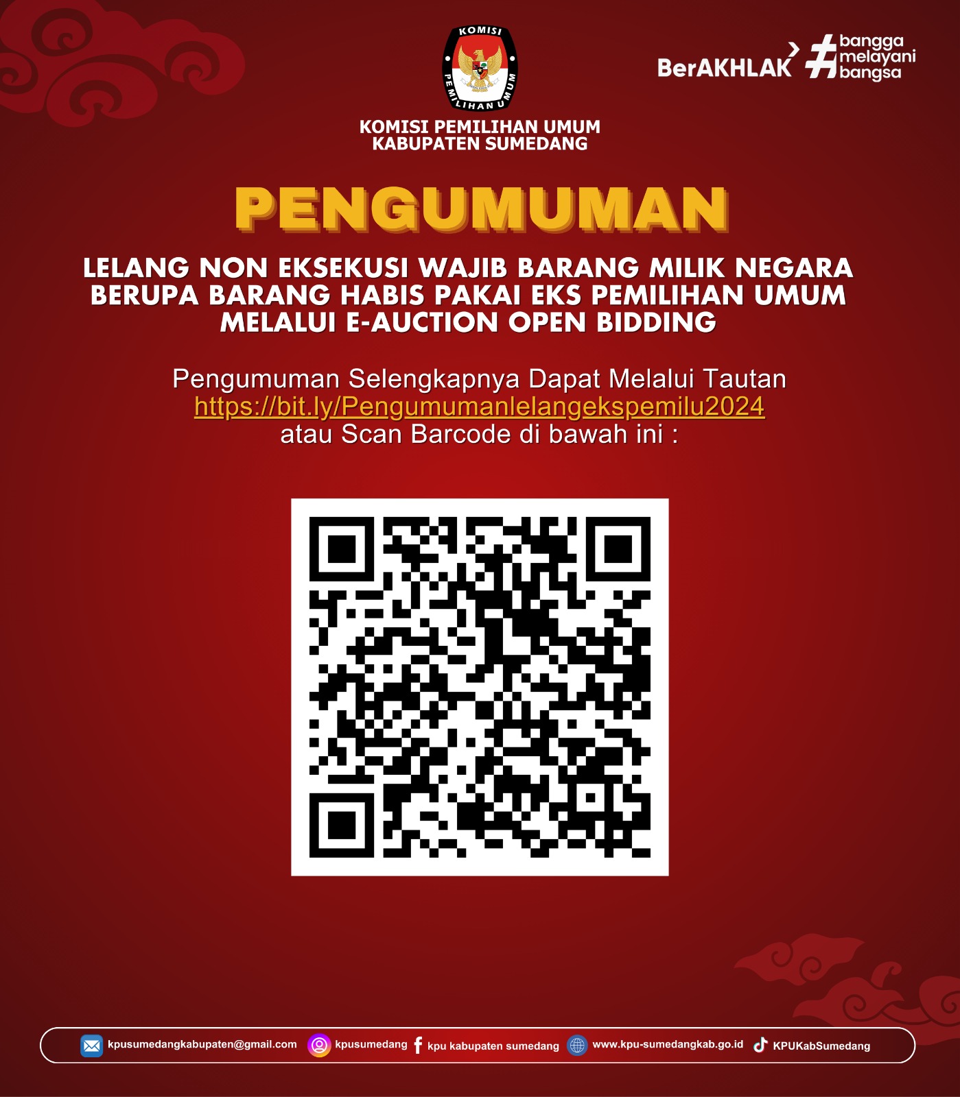 KPU Kabupaten Sumedang, akan melaksanakan lelang Barang Milik Negara melalui perantaraan Kantor Pelayanan Kekayaan Negara dan Lelang (KPKNL) Bandung dengan cara penawaran terbuka (open bidding) melalui internet, dengan objek berupa Logistik Pasca Pemilu 2024 dengan rincian sebagai berikut: