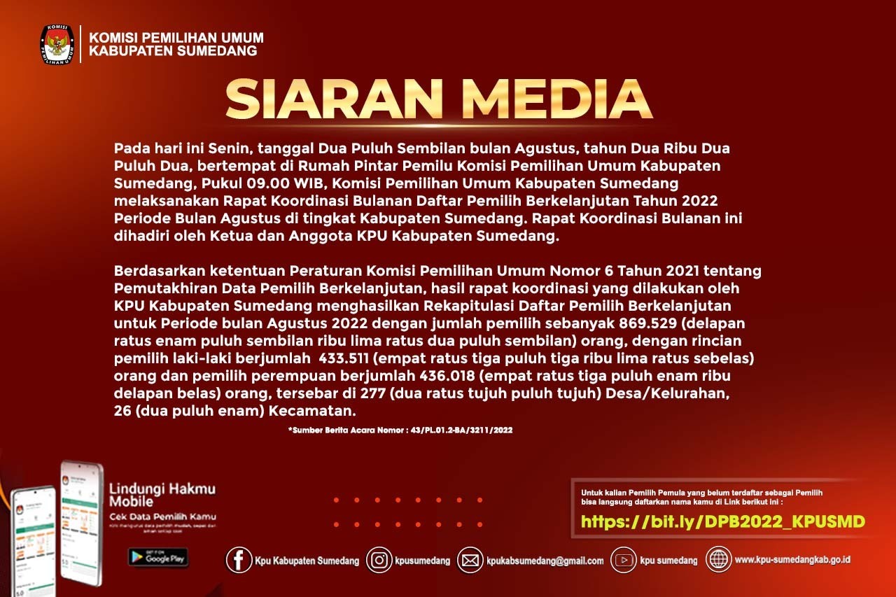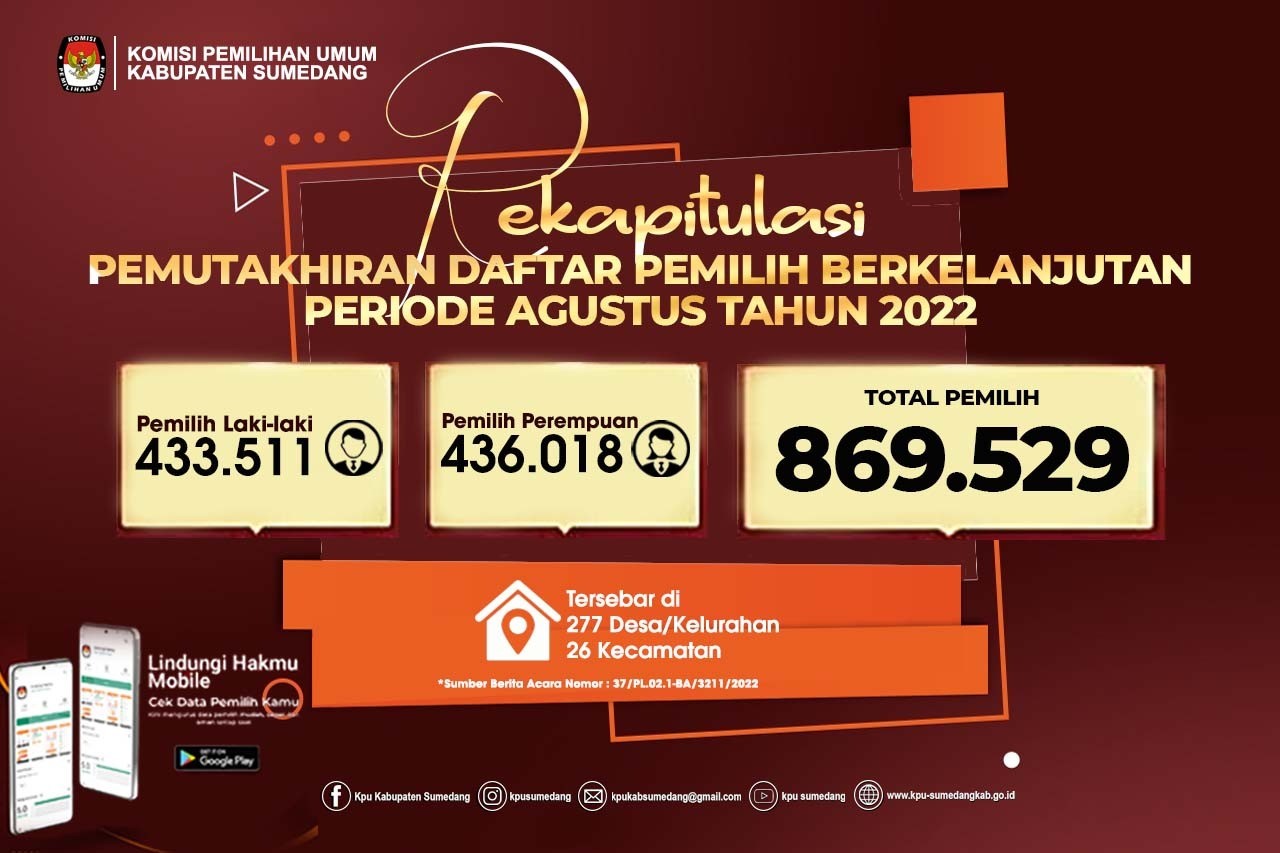 Berdasarkan ketentuan Peraturan Komisi Pemilihan Umum Nomor 6 Tahun 2021 tentang Pemutakhiran Data Pemilih Berkelanjutan, hasil rapat koordinasi yang dilakukan oleh KPU Kabupaten Sumedang menghasilkan Rekapitulasi Daftar Pemilih Berkelanjutan untuk Periode bulan Agustus 2022 dengan jumlah pemilih sebanyak 869.529 (delapan ratus enam puluh sembilan ribu lima ratus dua puluh sembilan) orang, dengan rincian pemilih laki-laki berjumlah 433.511 (empat ratus tiga puluh tiga ribu lima ratus sebelas) orang dan pemilih perempuan berjumlah 436.018 (empat ratus tiga puluh enam ribu delapan belas) orang, tersebar di 277 (dua ratus tujuh puluh tujuh) Desa/Kelurahan, 26 (dua puluh enam) Kecamatan.