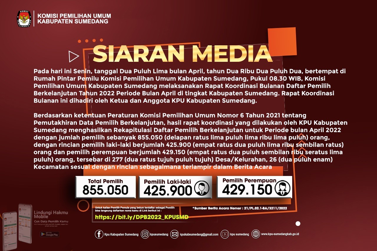 Berdasarkan ketentuan Peraturan Komisi Pemilihan Umum Nomor 6 Tahun 2021 tentang Pemutakhiran Data Pemilih Berkelanjutan, hasil rapat koordinasi yang dilakukan oleh KPU Kabupaten Sumedang menghasilkan Rekapitulasi Daftar Pemilih Berkelanjutan untuk Periode bulan April 2022 dengan jumlah pemilih sebanyak 855.050 (delapan ratus lima puluh lima ribu lima puluh) orang, dengan rincian pemilih laki-laki berjumlah 425.900 (empat ratus dua puluh lima ribu sembilan ratus) orang dan pemilih perempuan berjumlah 429.150 (empat ratus dua puluh sembilan ribu seratus lima puluh) orang, tersebar di 277 (dua ratus tujuh puluh tujuh) Desa/Kelurahan, 26 (dua puluh enam) Kecamatan sesuai dengan rincian sebagaimana terlampir dalam Berita Acara.
