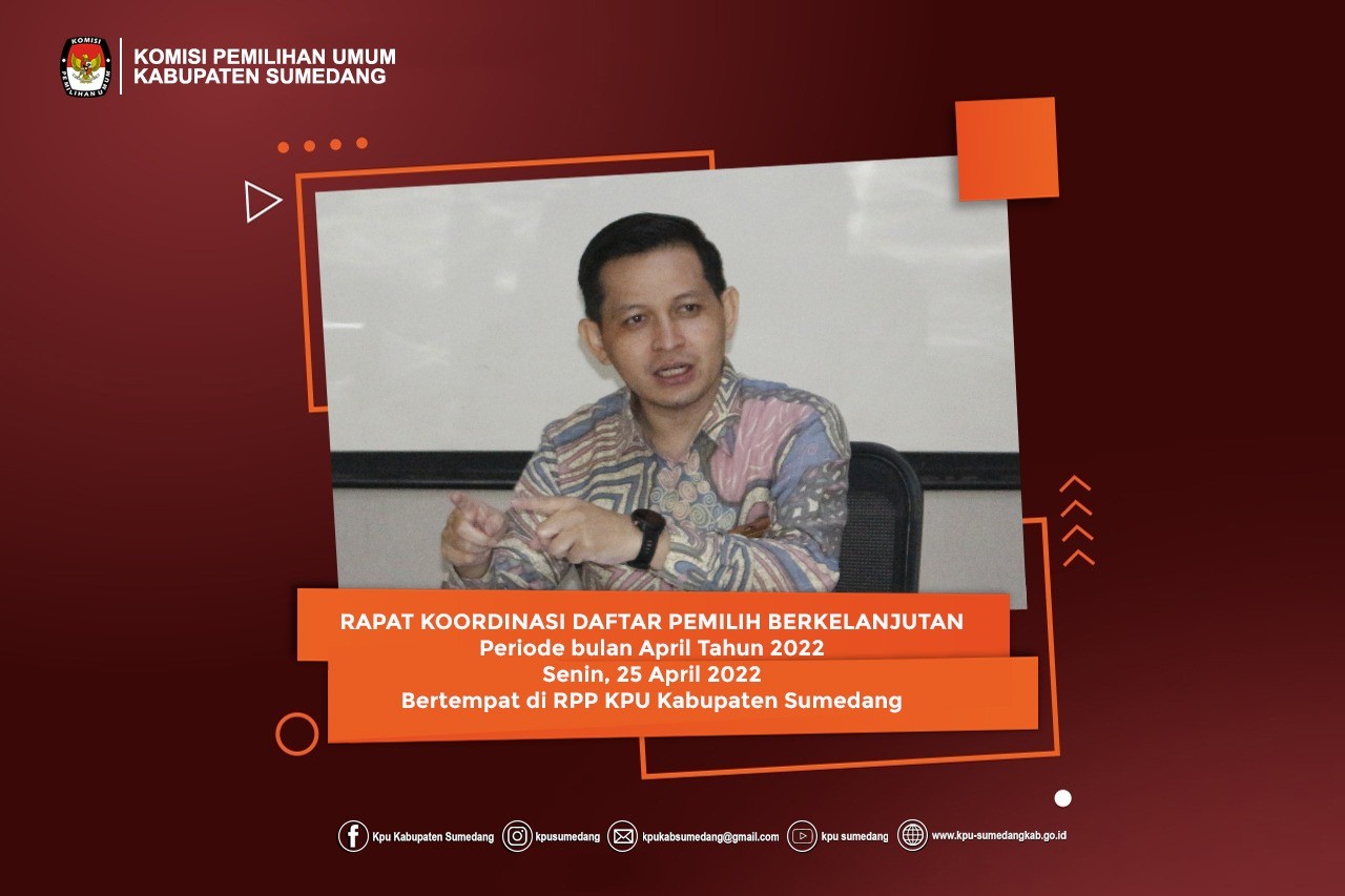Pada hari ini Senin, tanggal Dua Puluh Lima bulan April, tahun Dua Ribu Dua Puluh Dua, bertempat di Rumah Pintar Pemilu Komisi Pemilihan Umum Kabupaten Sumedang, Pukul 08.30 WIB, Komisi Pemilihan Umum Kabupaten Sumedang melaksanakan Rapat Koordinasi Bulanan Daftar Pemilih Berkelanjutan Tahun 2022 Periode Bulan April di tingkat Kabupaten Sumedang. Rapat Koordinasi Bulanan ini dihadiri oleh Ketua dan Anggota KPU Kabupaten Sumedang.