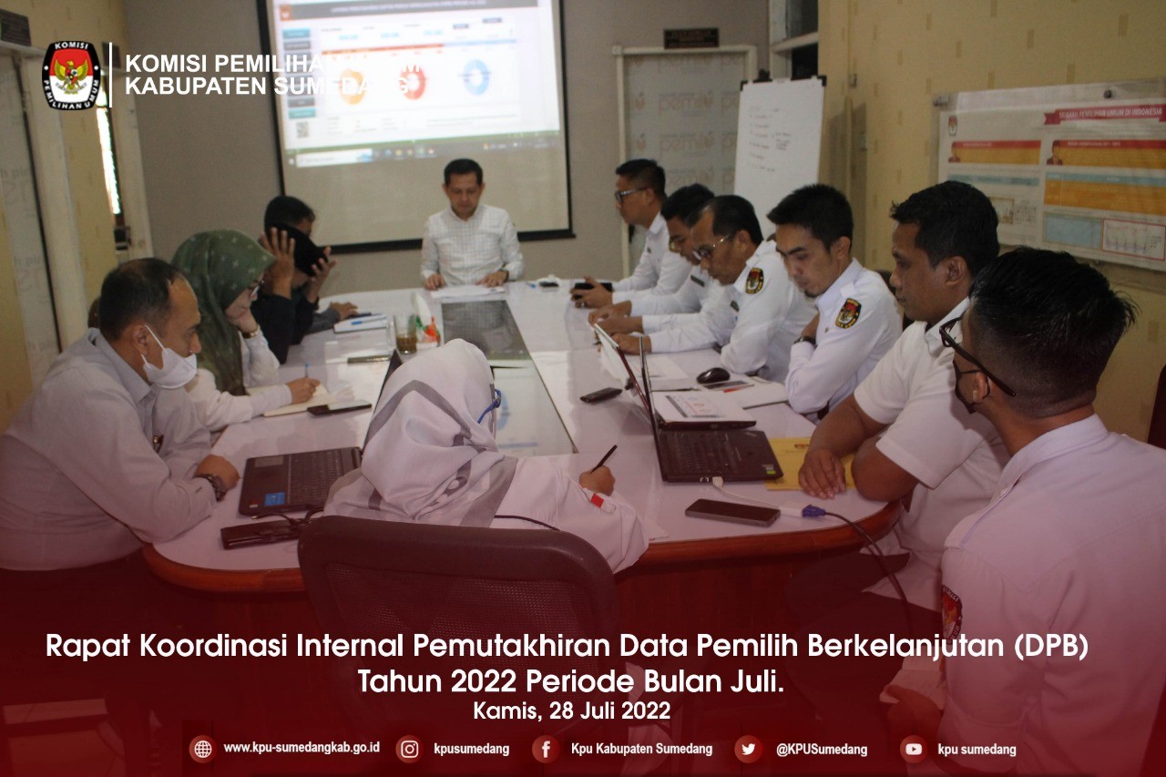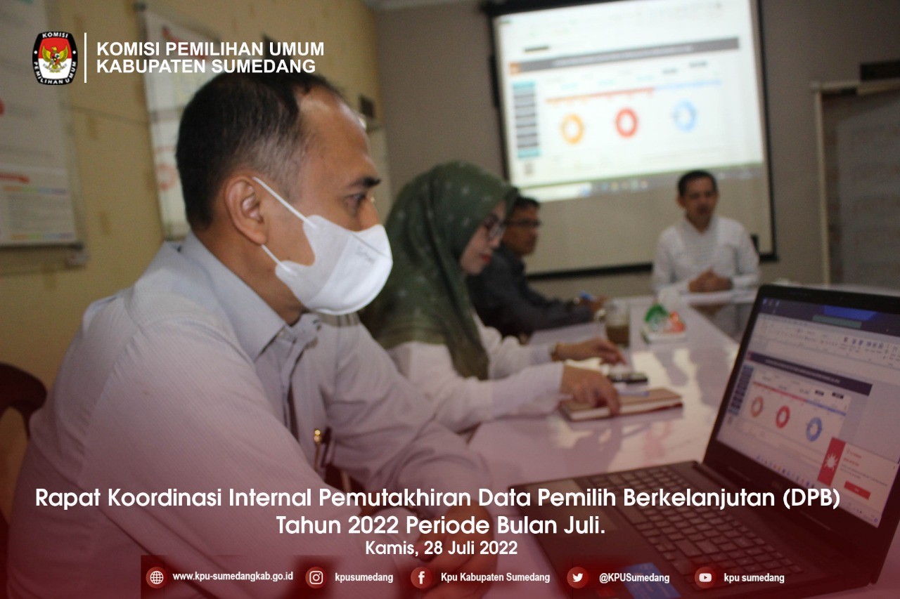 Pada hari ini Kamis, tanggal Dua Puluh Delapan bulan Juli, tahun Dua Ribu Dua Puluh Dua, bertempat di Rumah Pintar Pemilu Komisi Pemilihan Umum Kabupaten Sumedang, Pukul 09.00 WIB, Komisi Pemilihan Umum Kabupaten Sumedang melaksanakan Rapat Koordinasi Bulanan Daftar Pemilih Berkelanjutan Tahun 2022 Periode Bulan Juli di tingkat Kabupaten Sumedang. Rapat Koordinasi Bulanan ini dihadiri oleh Ketua dan Anggota KPU Kabupaten Sumedang.