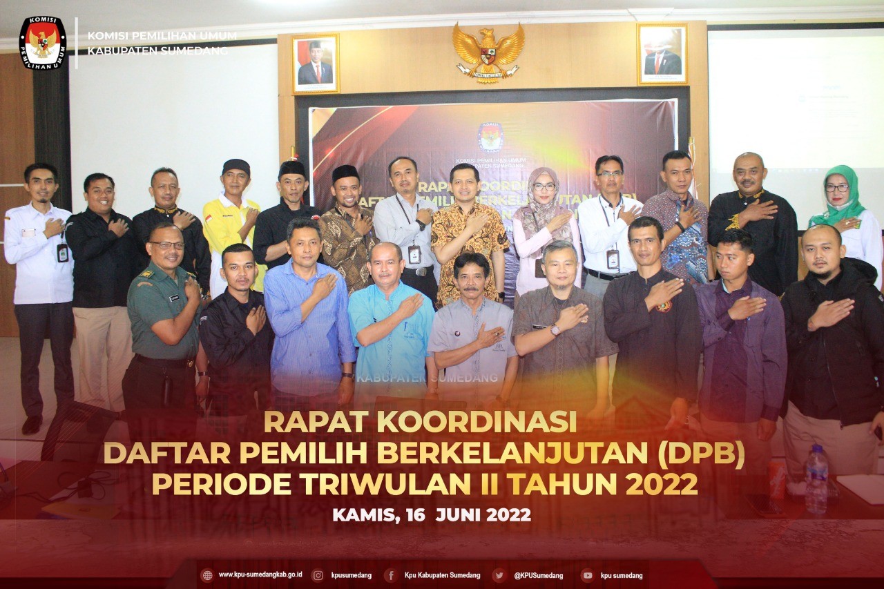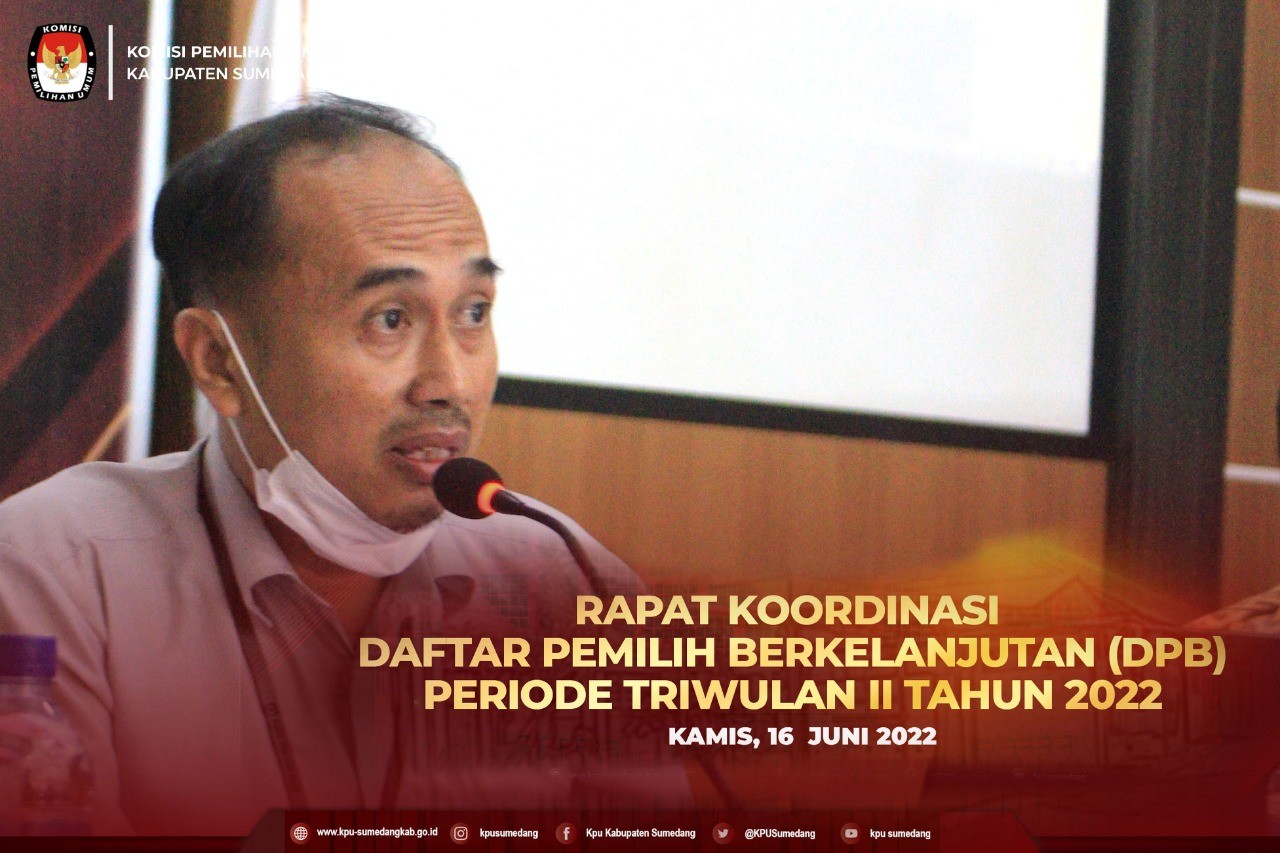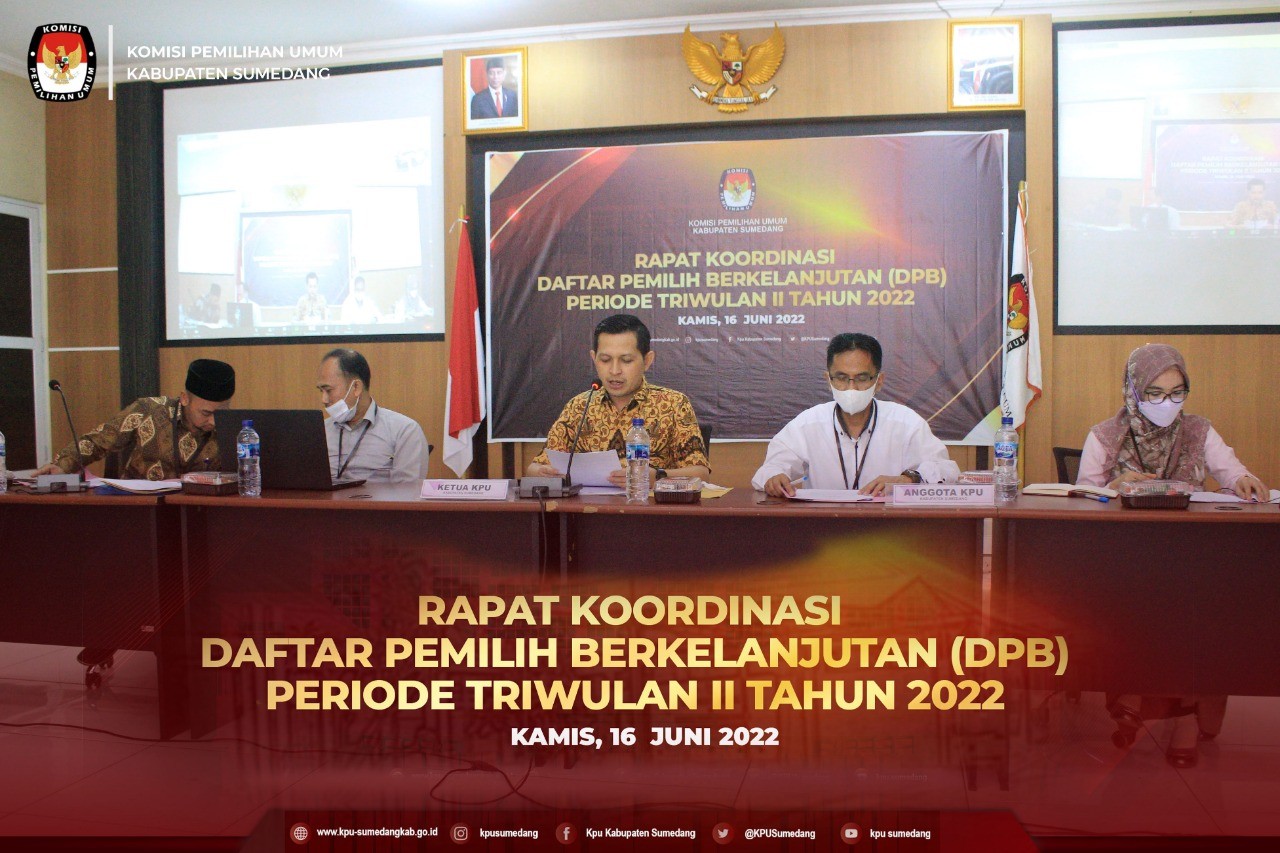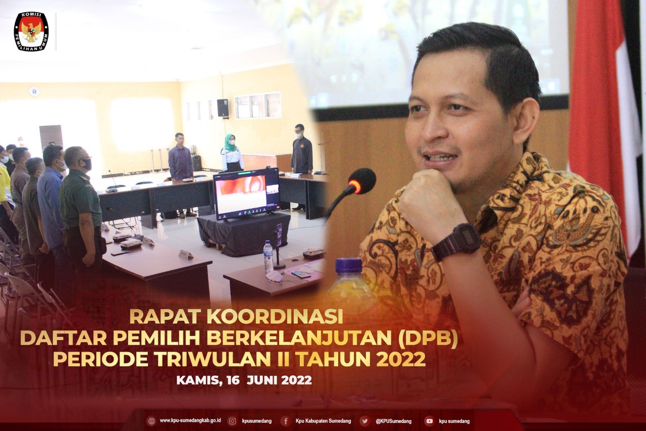 Sumedang 16/06/2022. Kamis Pagi, KPU Kabupaten Sumedang telah melaksanakan Rapat Koordinasi Daftar Pemilih Berkelanjutan Tahun 2022 Periode Triwulan II. Kegiatan ini diselenggarakan sebagai bentuk konsolidasi rapat rutin dan Rekapitulasi Data Pemilih Berkelanjutan rutin sekaligus forum koordinasi yang dihadiri unsur Forkopimda oleh Kodim 0610/Sumedang, Polres Sumedang; Penyelenggara Pemilu oleh Bawaslu; Lembaga Struktural oleh Badan Pusat Statistik, Kantor Kemenag, Cabang Dinas Pendidikan wilayah VIII; unsur SKPD, Dinas/Instansi oleh Disdukcapil Kab. Sumedang, Dinas Sosial, Kesbangpol, Tata Pemerintahan Setda Kab. Sumedang, Perwakilan Camat se Kabupaten; Unsur Partai Politik; dan unsur organisasi/asosisi oleh APDESI, PPDI, Kelompok Kerja Kepala Sekolah SMA, SMK serta Madrasah Aliayah.