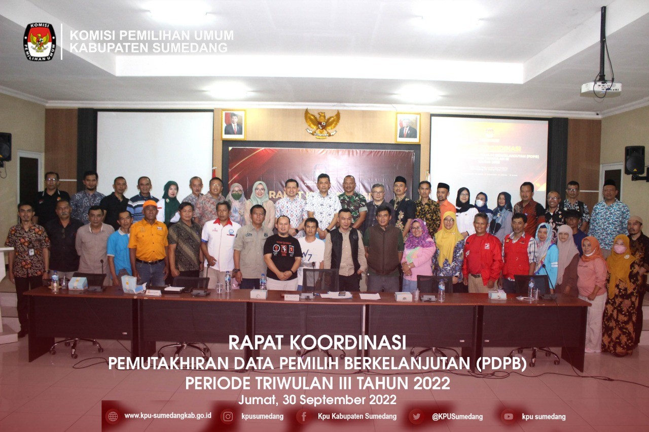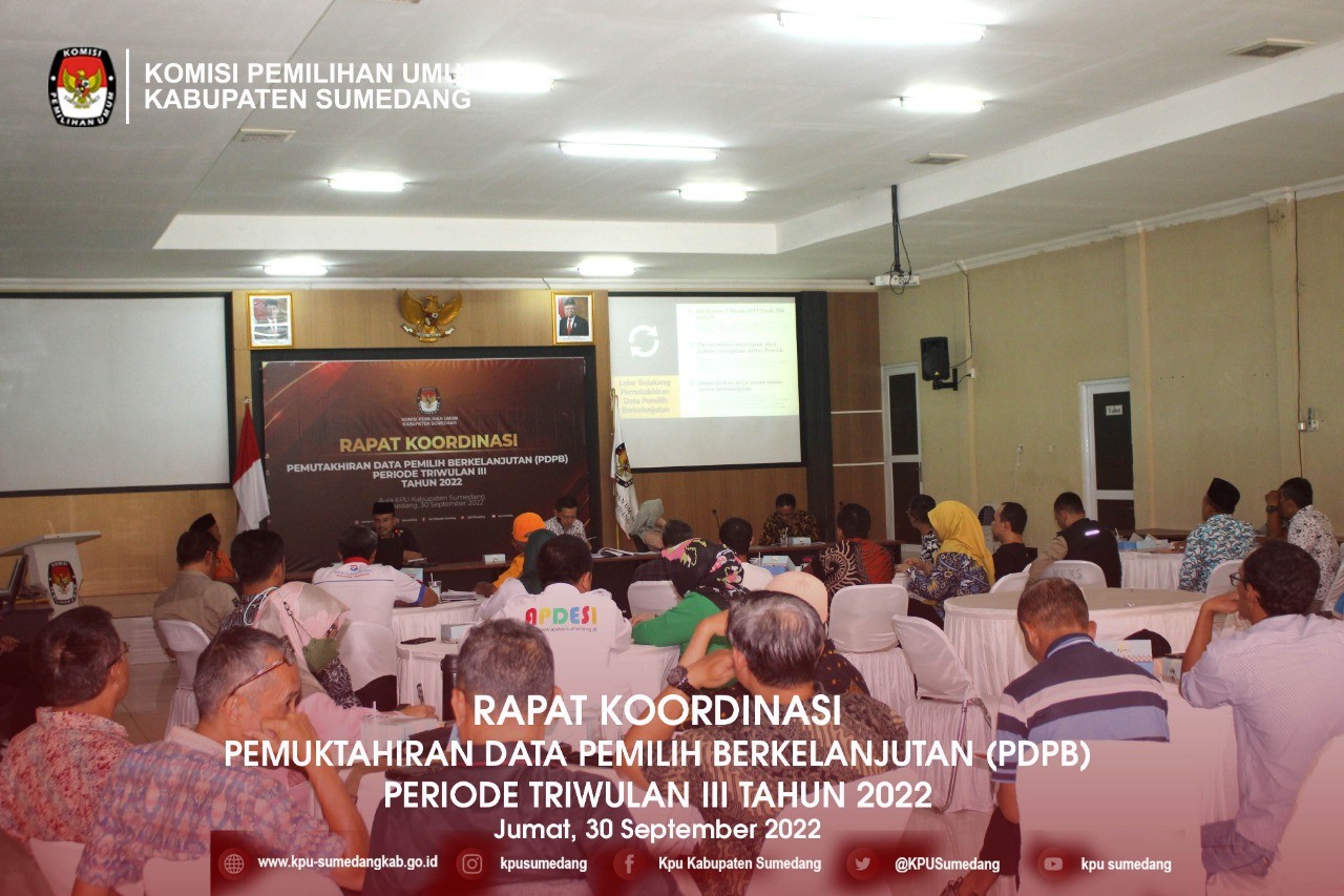 Pada hari ini Jumat, tanggal Tiga Puluh bulan September, tahun Dua Ribu Dua Puluh Dua, bertempat di Aula Komisi Pemilihan Umum Kabupaten Sumedang, Pukul 13.00 WIB, Komisi Pemilihan Umum Kabupaten Sumedang melaksanakan Rapat Koordinasi Data Pemilih Berkelanjutan Tahun 2022 Periode Triwulan III di tingkat Kabupaten Sumedang. Rapat Koordinasi ini dihadiri oleh: