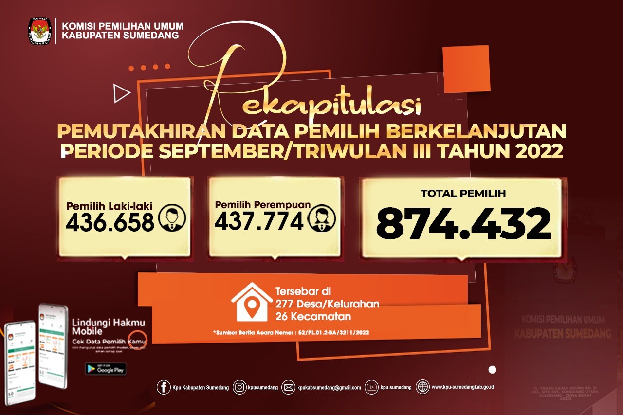 Rekapitulasi Daftar Pemilih Berkelanjutan untuk Periode Triwulan III dengan jumlah pemilih sebanyak 874.432 (delapan ratus tujuh puluh empat ribu empat ratus tiga puluh dua) orang, dengan rincian pemilih laki-laki berjumlah 436.658 (empat ratus tiga puluh enam ribu enam ratus lima puluh delapan) orang dan pemilih perempuan berjumlah 437.774 (empat ratus tiga puluh tujuh ribu tujuh ratus tujuh puluh empat) orang sesuai dengan rincian sebagaimana terlampir dalam Berita Acara ini.