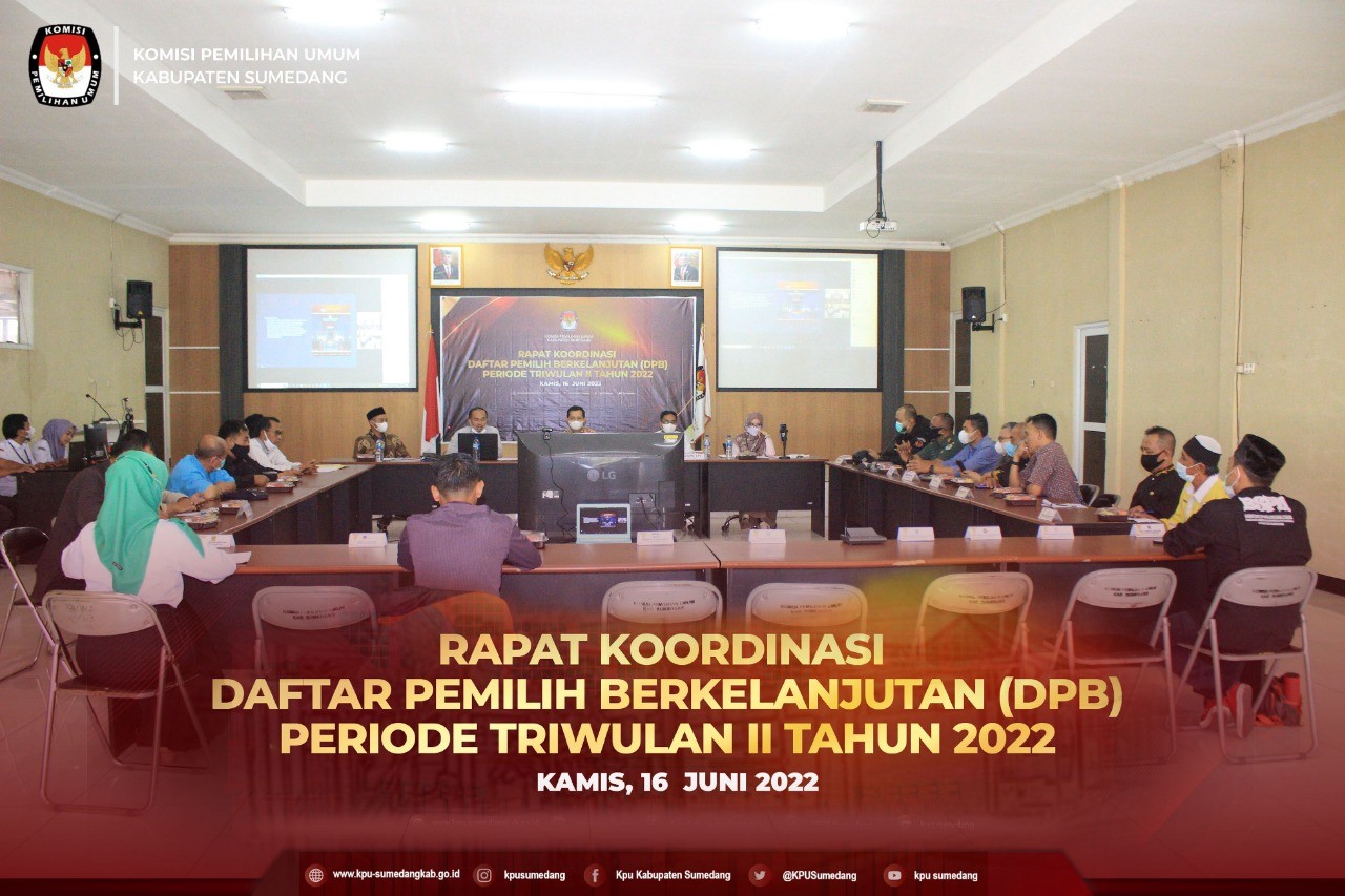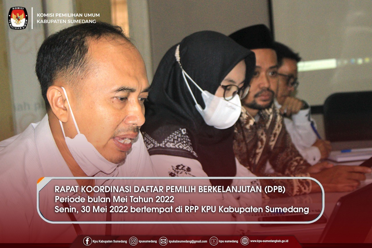 Pada hari ini Senin, tanggal Tiga Puluh bulan Mei, tahun Dua Ribu Dua Puluh Dua, bertempat di Rumah Pintar Pemilu Komisi Pemilihan Umum Kabupaten Sumedang, Pukul 09.00 WIB, Komisi Pemilihan Umum Kabupaten Sumedang melaksanakan Rapat Koordinasi Bulanan Daftar Pemilih Berkelanjutan Tahun 2022 Periode Bulan Mei di tingkat Kabupaten Sumedang. Rapat Koordinasi Bulanan ini dihadiri oleh Ketua dan Anggota KPU Kabupaten Sumedang. Berdasarkan ketentuan Peraturan Komisi Pemilihan Umum Nomor 6 Tahun 2021 tentang Pemutakhiran Data Pemilih Berkelanjutan, hasil rapat koordinasi yang dilakukan oleh KPU Kabupaten Sumedang menghasilkan Rekapitulasi Daftar Pemilih Berkelanjutan untuk Periode bulan Mei 2022 dengan jumlah pemilih sebanyak 855.171 (delapan ratus lima puluh lima ribu seratus tujuh puluh satu) orang, dengan rincian pemilih laki-laki berjumlah 425.953 (empat ratus dua puluh lima ribu sembilan ratus lima puluh tiga) orang dan pemilih perempuan berjumlah 429.218 (empat ratus dua puluh sembilan ribu dua ratus delapan belas) orang, tersebar di 277 (dua ratus tujuh puluh tujuh) Desa/Kelurahan, 26 (dua puluh enam) Kecamatan sesuai dengan rincian sebagaimana terlampir dalam Berita Acara. Unduh Berita Acara beserta lampiran pada link di bawah : BA Rakor DPB Periode Bulan Mei # Cek hak pilih anda pada portal lindungihakmu.kpu.go.id atau bisa download aplikasi Lindungi Hakmu mobile di Play Store # Untuk kalian Pemilih Pemula yang belum terdaftar sebagai Pemilih bisa langsung daftarkan nama kamu di Link berikut ini : https://bit.ly/DPB2022_KPUSMD