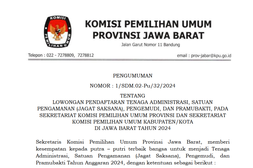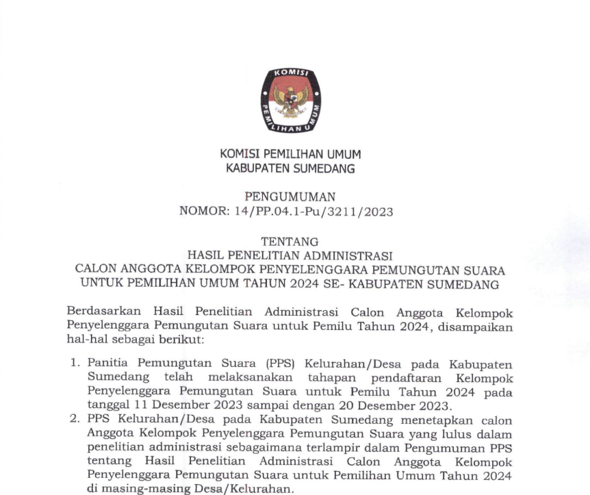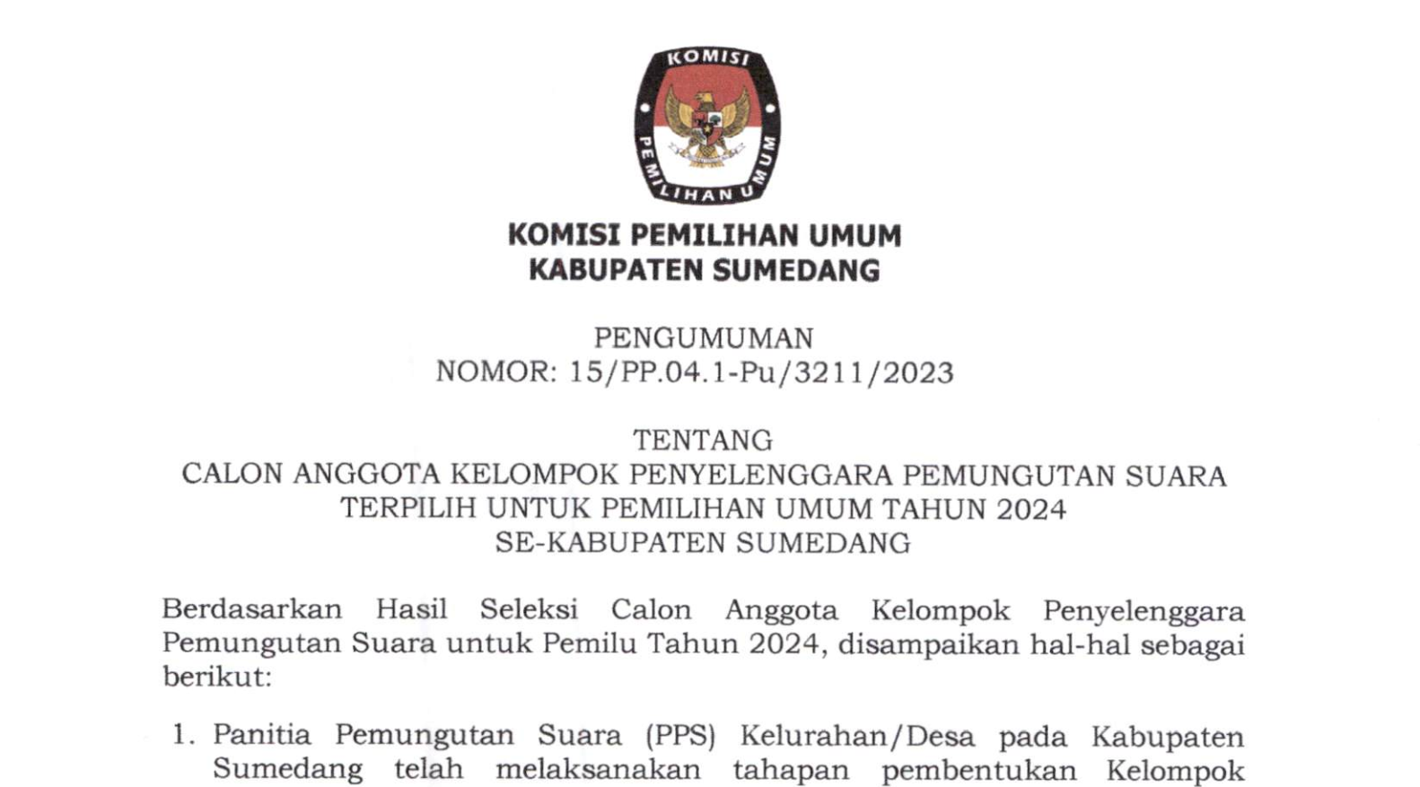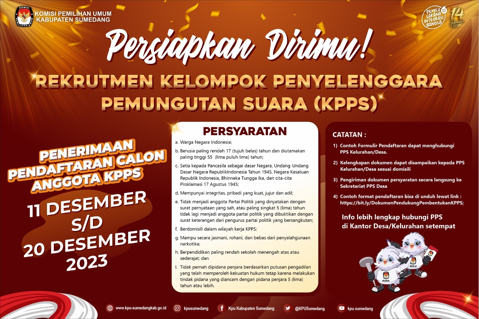Dalam rangka pembentukan Kelompok Penyelenggara Pemungutan Suara (KPPS) untuk Pemilihan Umum Tahun 2024, Komisi Pemilihan Umum Kabupaten Sumedang mengundang Warga Negara Indonesia yang memenuhi persyaratan untuk mendaftarkan diri menjadi anggota KPPS untuk Pemilihan UmumTahun 2024 dengan ketentuan sebagai berikut: