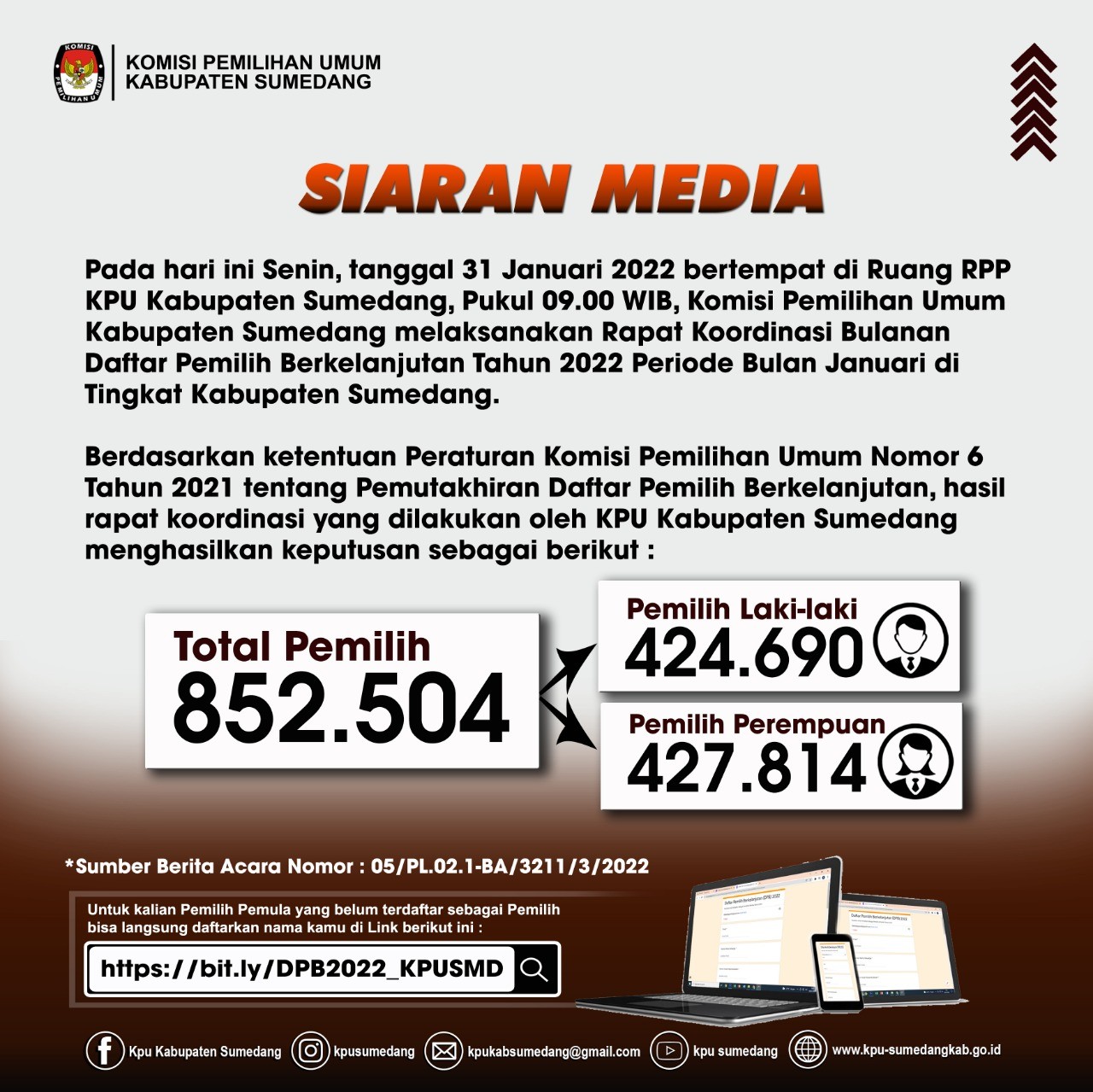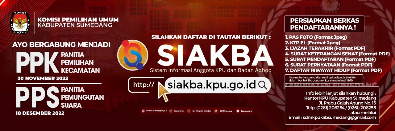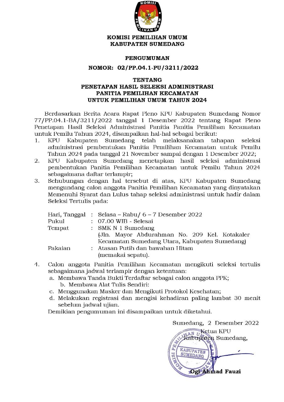Dalam rangka pembentukan Panitia Pemilihan Kecamatan untuk Pemilihan Umum, Komisi Pemilihan Umum Kabupaten Sumedang mengundang Warga Negara Indonesia yang memenuhi persyaratan untuk mendaftarkan diri menjadi anggota Panitia Pemilihan Kecamatan untuk Pemilihan Umum dengan ketentuan sebagai berikut: