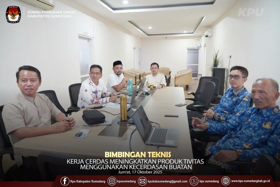 Sumedang – Dalam upaya mendukung transformasi digital dan meningkatkan efisiensi pelaksanaan tugas serta fungsi kelembagaan, Komisi Pemilihan Umum (KPU) berinisiatif memperkenalkan sekaligus mengintegrasikan teknologi kecerdasan buatan (AI) ke dalam proses kerja organisasi. Sebagai bagian dari dukungan terhadap program tersebut, KPU Kabupaten Sumedang mengikuti Webinar Series Bimbingan Teknis “Kerja Cerdas Meningkatkan Kecerdasan Buatan AI (Artificial Intelligence) di Lingkungan Komisi Pemilihan Umum” yang diselenggarakan secara daring pada Jumat, 17 Oktober 2025. Kegiatan dibuka oleh Anggota KPU RI, Betty Epsilon Idroos, yang dalam sambutannya menegaskan pentingnya pemanfaatan teknologi AI untuk memperkuat transformasi digital, meningkatkan kualitas pelayanan publik, serta mendukung transparansi dan efisiensi kerja di seluruh jajaran KPU. Kegiatan ini menghadirkan narasumber Technical Consultant Manager Nutanix, Arief Pribadi, serta Kapusdatin KPU bersama jajaran Pusdatin KPU Provinsi/KIP Aceh dan KPU Kabupaten/Kota se-Indonesia. Melalui bimtek ini, SDM KPU diharapkan mampu beradaptasi dengan perkembangan teknologi sekaligus memanfaatkannya secara optimal demi pelayanan publik yang lebih transparan, efisien, dan tepercaya.